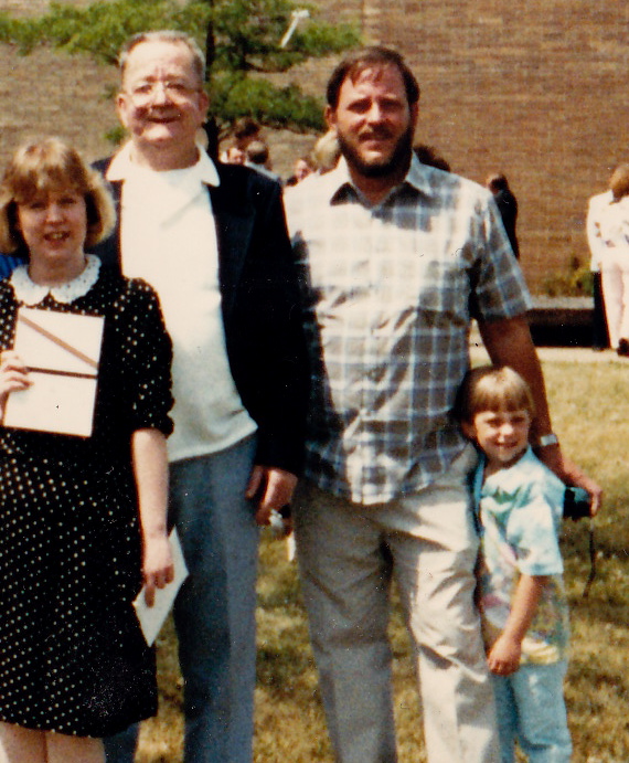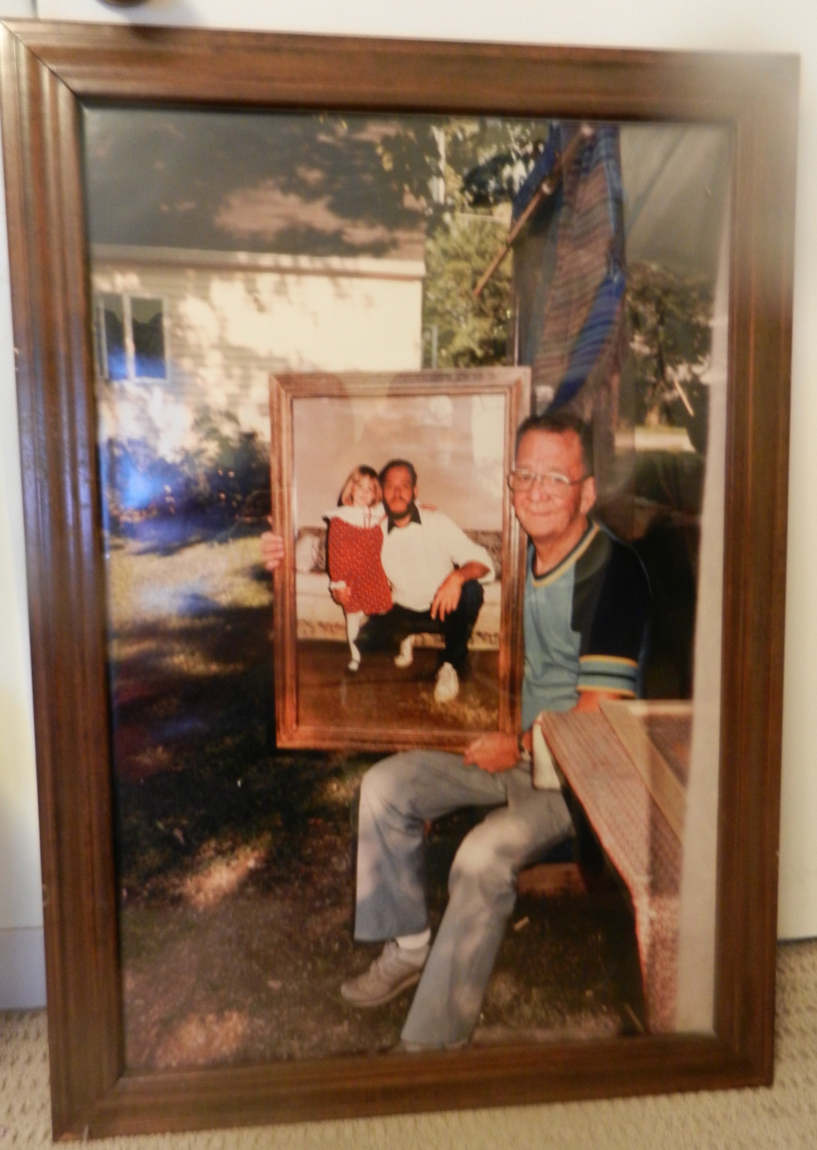 They discovered that you could make photos into 16 x 20 posters for a reasonable cost. Thus began โthe big pictureโ era. Pictures would be blown up for birthdays and exchanged as Christmas gifts. My brother Jerry and my dad took it to a whole new level. They began to make pictures frames for these photos. I think they really thought that everyone wanted poster size pictures in their houses. It actually got to the point where a picture was taken of my dad, holding a framed 16 x 20 poster of my brother and his daughter, Tracie. My brother, Jerry, in turn had that picture blown up to poster size and framed for my dad. (And I found this very picture in my closet this week!!!! ๐ )