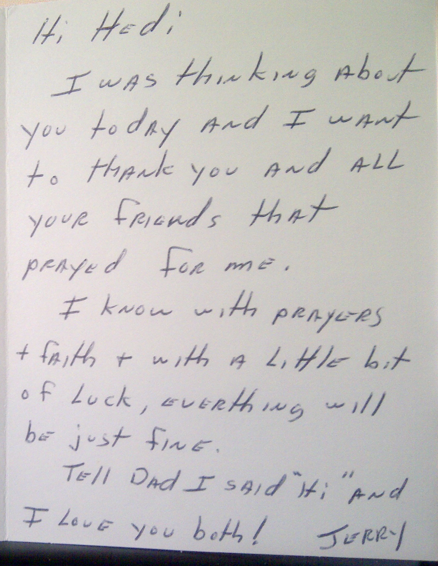 It reminded me of a card that my brother Jerry sent me shortly before he died. I still have it in my memory box. When I got home from visiting Tracie last week, I pulled it out and read it again. It never ceases to encourage me and make me tear up and appreciate my brother. And I am reminded of what God did in his life before he died. And that one day, I will be with him and my dad, worshipping Jesus…the One who made us all whole.