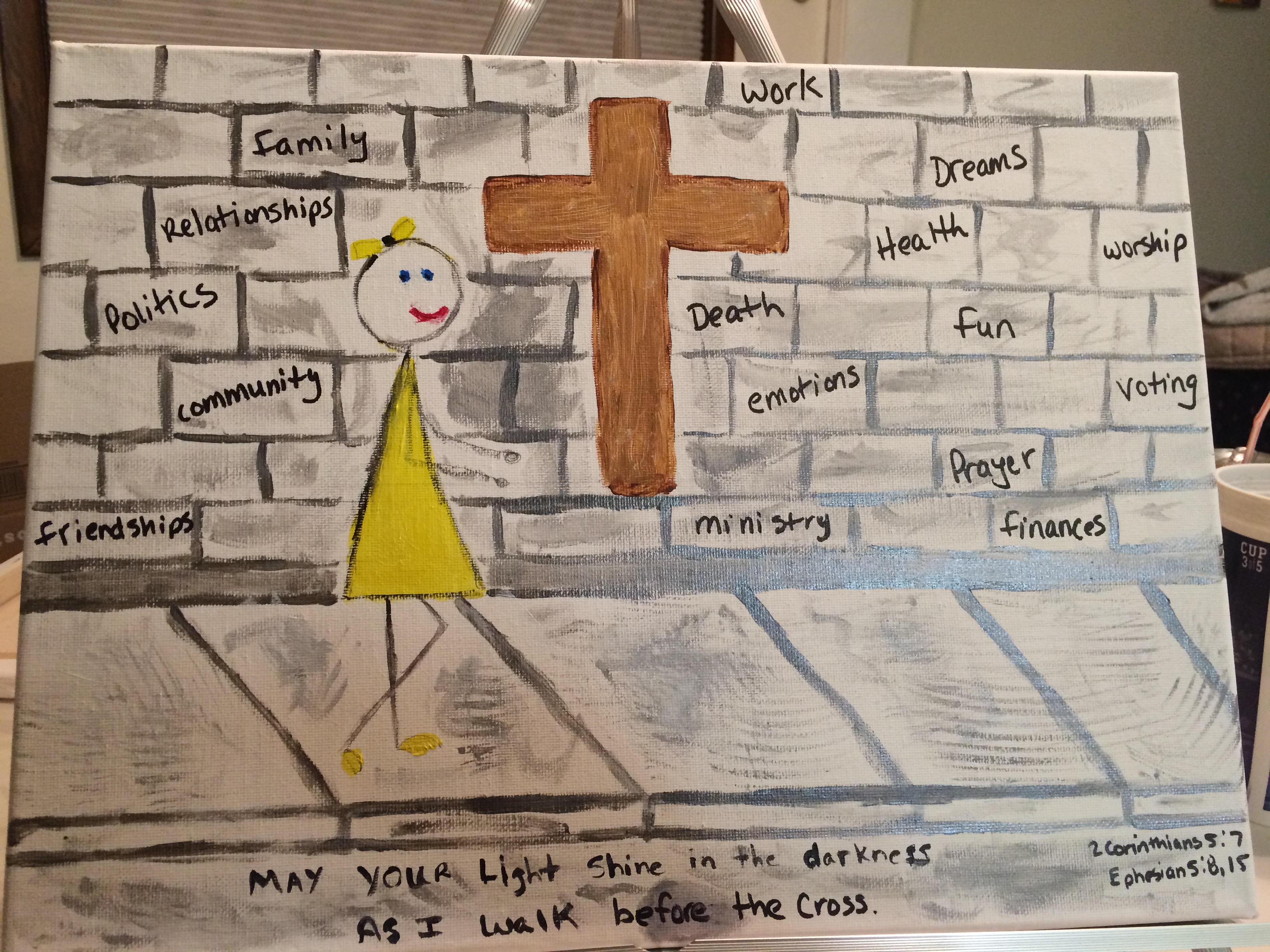 My first painting I attempted was a picture/vision I had during worship a few years back. I had the vision several times and so one day, I drew it out in my office. I hung the piece of paper on my wall to remind me of what my walk with Jesus should look like. I thought “one day I am going to get someone to paint this for me.” Who knew that person would be me!
