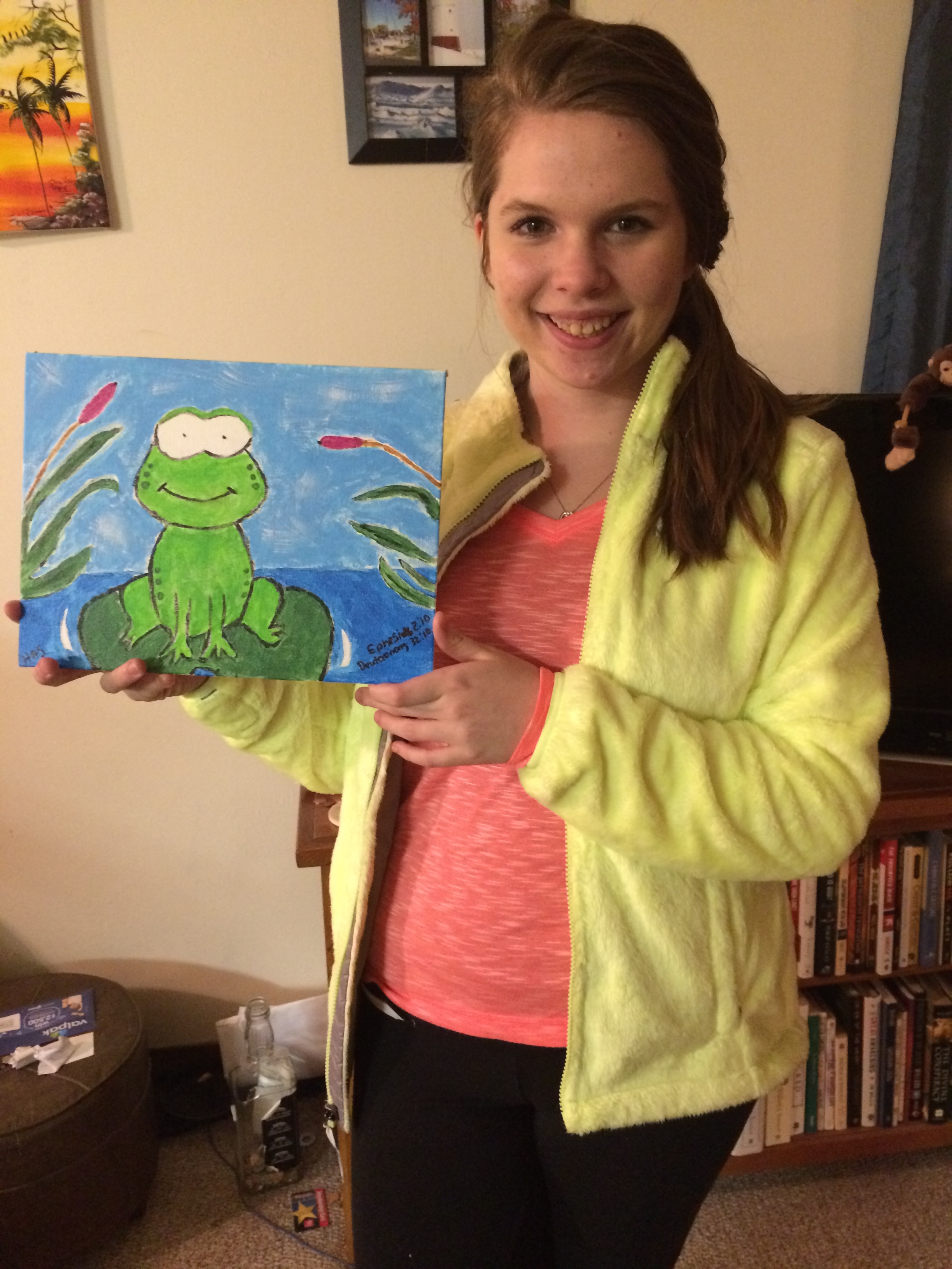 My second painting was for niece, Madison. She saw my first one and said she wanted me to do one for her. She loves frogs so I thought I would surprise her and do one. Again, I put on worship music and painted. I spent two hours praying for her. Praying that she would know that she is God’s workmanship, that He has purposes and plans for her, that she would know how much God loves her. When it was done, I signed it and put two Scriptures on it that came to mind as I painted.